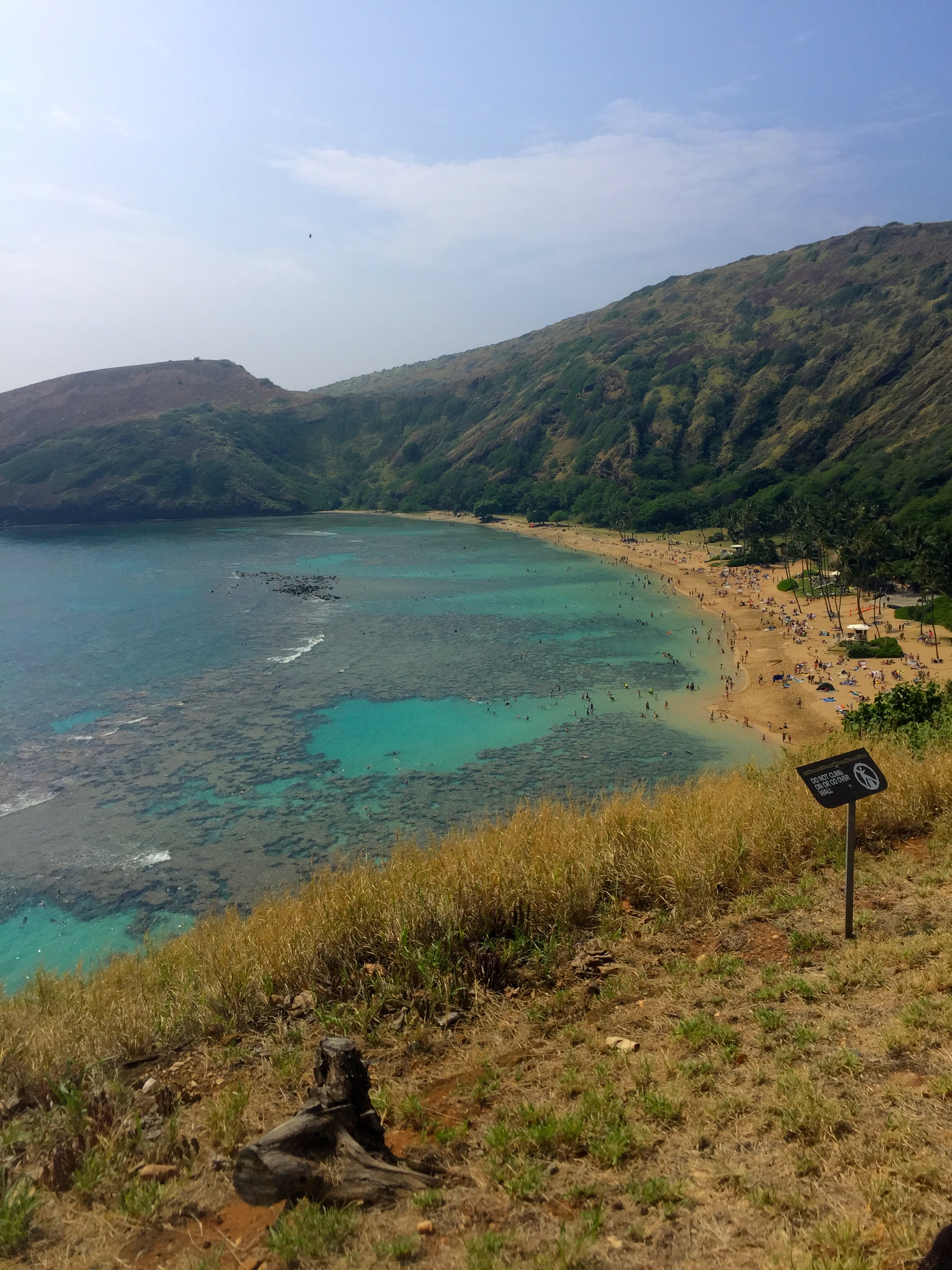 I snorkeled for the first time this past Christmas in Thailand and was looking forward to snorkeling in Hawaii. We saw a lot of pictures and read great reviews about Hanauma Bay in Oahu. When we got there, we were turned away because the lot was full, so we had to find our own parking. WARNING: right across the street from the entrance, there is a lot that looks like a parking lot..do NOT be fooled! It’s actually just a scenic overlook where many people park. You will get a $300 ticket PLUS be towed. We witnessed this ourselves and a few locals warned us. Just drive down a bit further and find street parking. After our hike to the Bay, we got in line, paid the entrance fee ($7.50/each) and watched the mandatory 15 minute video (you HAVE to watch it). My excitement was bubbling over…but went flat pretty quickly when we got down to the bay (we paid the $1 for the tram ride vs. the hike down), we were met with throngs of people…people everywhere. I originally planned on renting a life vest from the park (since I can’t multi task and snorkel while floating) but soon found out that they do not have life vests. Regardless of all this, I still tried to snorkel, but gave up after about 10 minutes because I just could not snorkel without a life vest. Some of you know that I have a growing fear of water (and am also a weakling so can’t swim too long) due to a near drowning last summer and while I am working on not allowing that to rule my life…I just could not swim and snorkel simultaneously. It was also frustrating to watch tourists walk on top of the corral reef, when the 15 minute mandatory video clearly stated that that is exactly what KILLS the reefs! After dodging one too many tourists, we decided to leave. I still recommend it if you are strong and can swim well (or bring your own life vest), but it just didn’t work out for us 😦