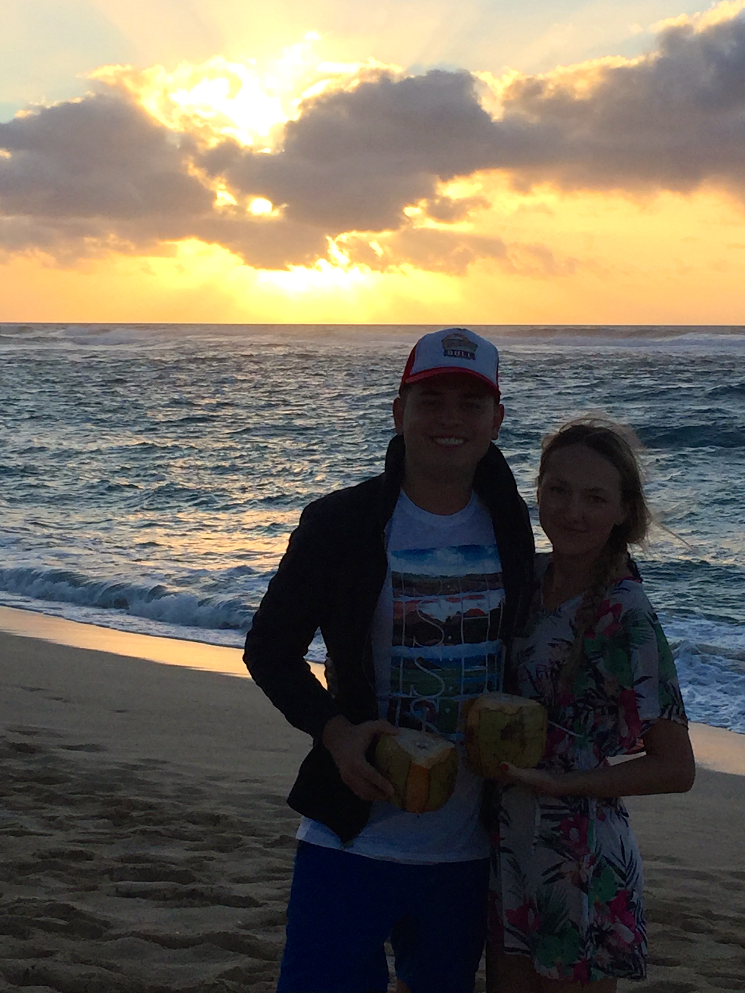 The next day after baking away under the sun, we drove to the North Shore to catch yet another breathtaking sunset. The drive took between 1-2 hours, but the scenery along the way was so worth this trip. On the way we stopped by a local fruit stand and bought coconuts, which became perfect sunset props after we quenched our thirst :p