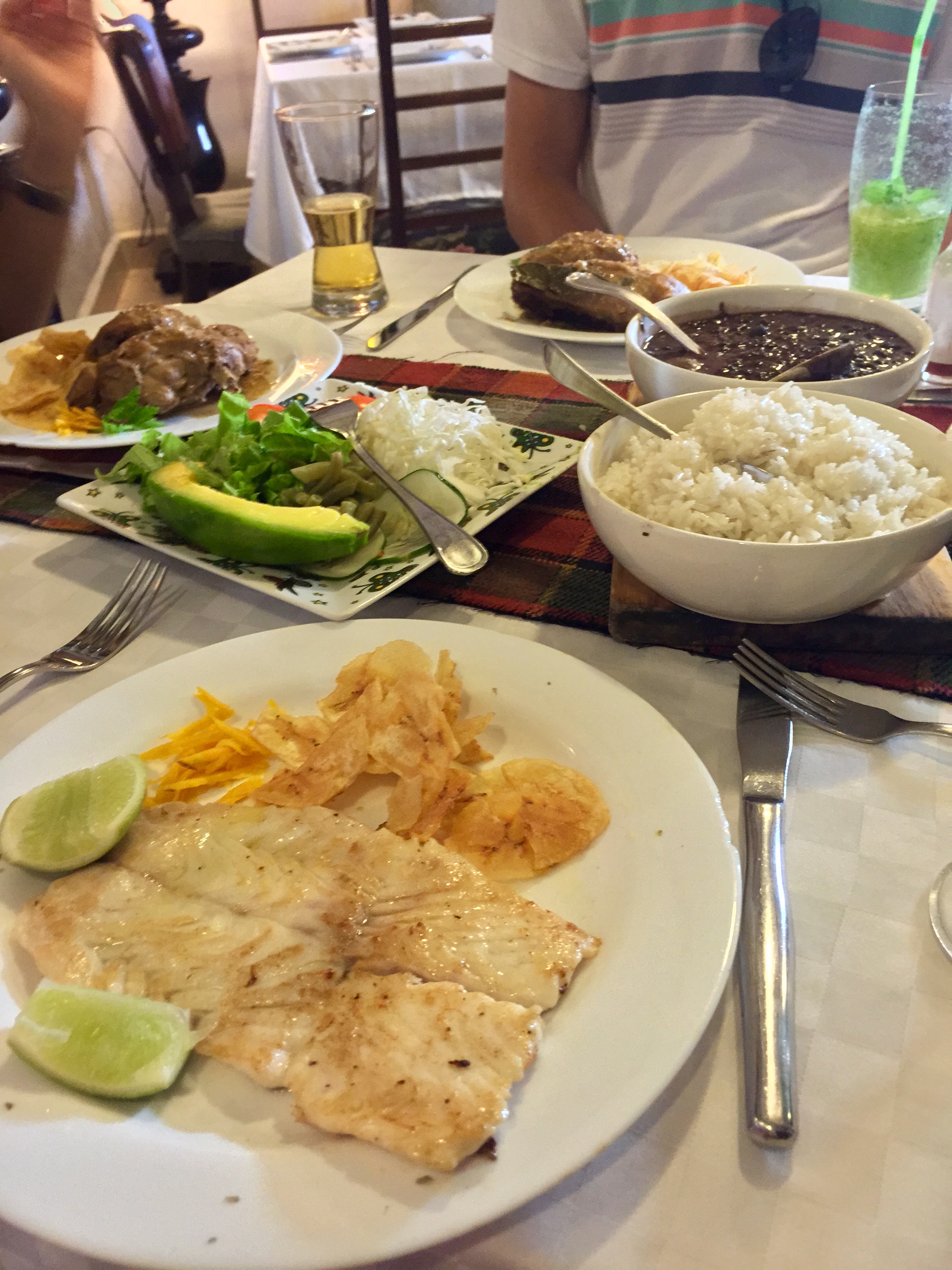 1. El Chanchullero de Tapas: We ate here on our first night and it was a delicious way to be introduced to Havana cuisine. This is a fairly small restaurant, with hip decor. We had to wait about twenty minutes for a table, but it was well worth it. There is no AC inside, just fans, so cold drinks are 100% more refreshing. We ordered croquettes as an appetizer ($2) and each ordered a different “meal dish.” I had a fish dish, our friends had shrimp and my husband had chicken. During our next visit, we also tried lamb and beef. Each plate comes with fresh vegetables (avocado, tomato, lettuce) and whatever protein you selected for a small price of $4-$6 (depending on your protein). Needless to say, this was a very delicious but cheap meal!